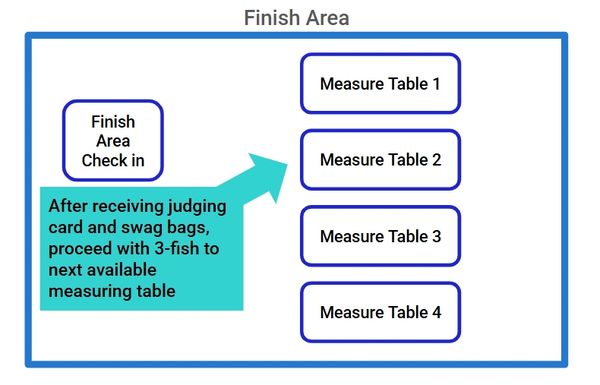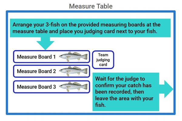 Lay your 3-fish stringer out on the three provided measuring boards and place your team's judging card alongside.